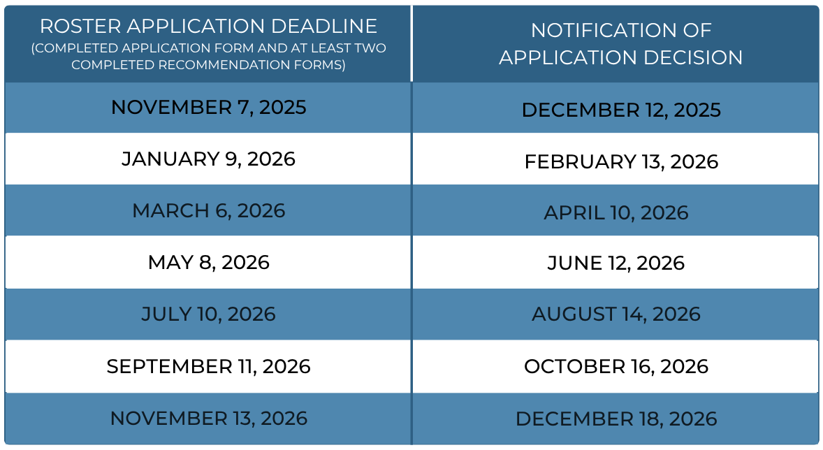 In order to join the Roster, eligible candidates should submit an application via the online application portal. Applications are accepted throughout the year.